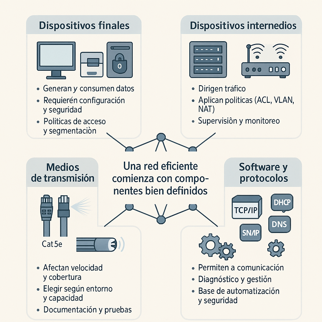 En el Tema 1 definimos qué es una red de computadoras. Ahora pasamos del concepto a los bloques tangibles que permiten que funcione. Conocer las capacidades, limitaciones y buenas prácticas de cada componente evita cuellos de botella y sienta las bases para los temas siguientes: tipos de redes (Tema 3), topologías (Tema 5) y dispositivos de interconexión en detalle (Tema 6).