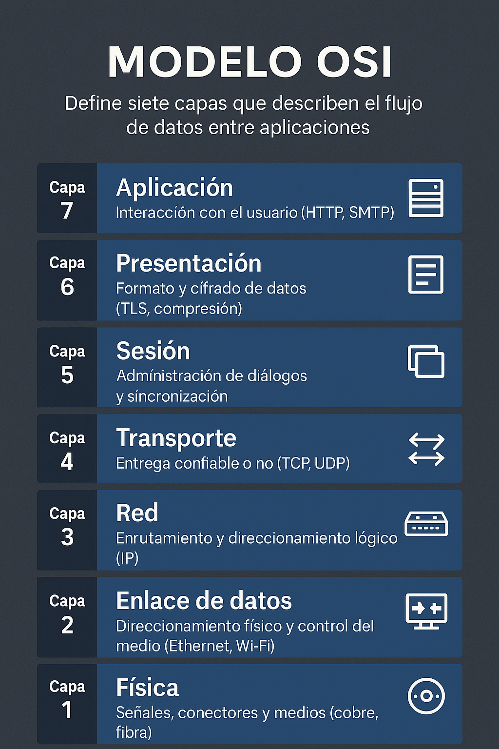 El modelo OSI (Open Systems Interconnection) define siete capas que describen el flujo de datos de una aplicación a otra. Aunque TCP/IP es el modelo operativo dominante, OSI sigue siendo una referencia pedagógica.